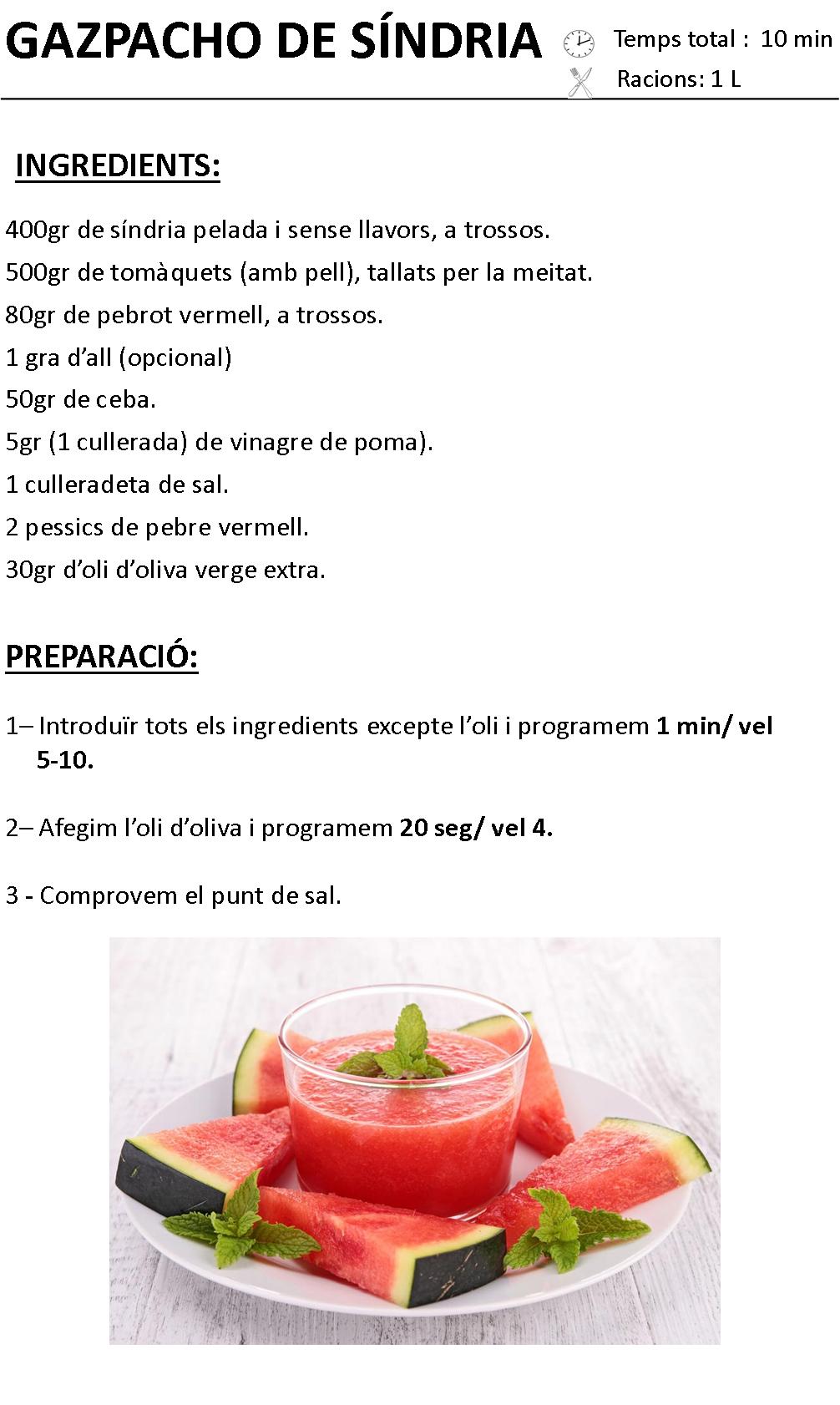 Una recepta perfecta per refrescar-te un dia d'estiu. El Gazpacho de síndria és una recepta que conté una llarga llista de beneficis pel nostre cor. La síndria està composta per un alt porcentatge d'aigua, és una gran font d'hidratació, raó per la qual, és molt utilitzada pels esportistes. A més, conté vitamina C, vitamina A, potassi, magnesi y diversos antioxidants.