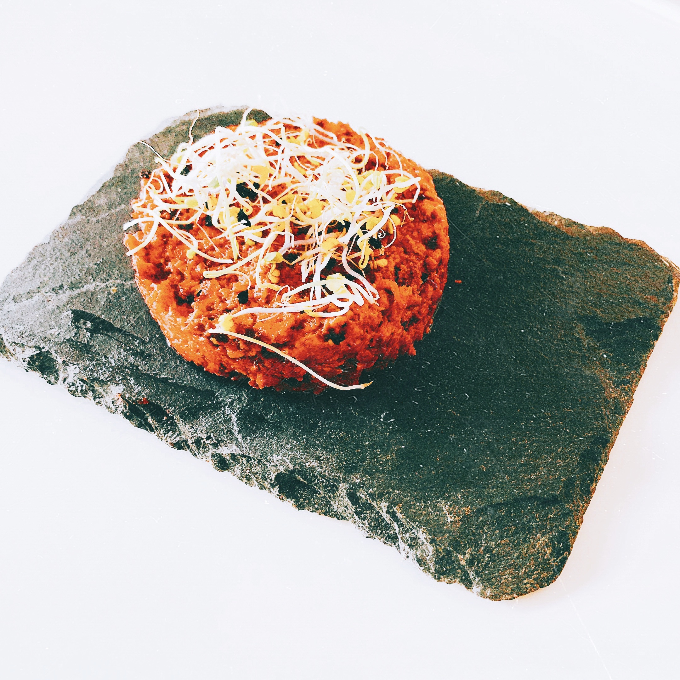 Hace tiempo que compraba la Beyond meat ( más allá de la carne) es una hamburguesa vegana 100% y de un aspecto muy parecido a la carne. Y me decidí hacer mi versión particular. El ingrediente principal es la proteína de soja o guisante y con el resto de ingredientes la hace una hamburguesa muy original y sabrosa. También he probado de hacerla con tempeh modificando ingredientes y también sale muy bien.