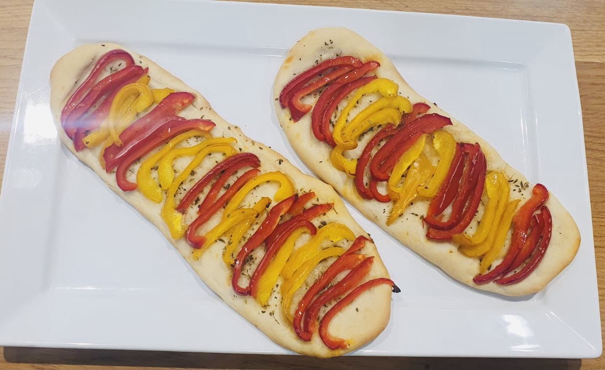3- Divideix la massa en 4 parts iguals, estén cada porció en tires de 9x25 cm amb les mans i per acabar et pots ajudar amb el corró. Posar les coques en la safata de forn, (hauràs de fer de dos en dos) empolvorar amb l'orenga i un rajolí d'oli. Posar a sobre les tires de pebrot tallades a làmines forma'n la senyera tal com es veu en la foto.