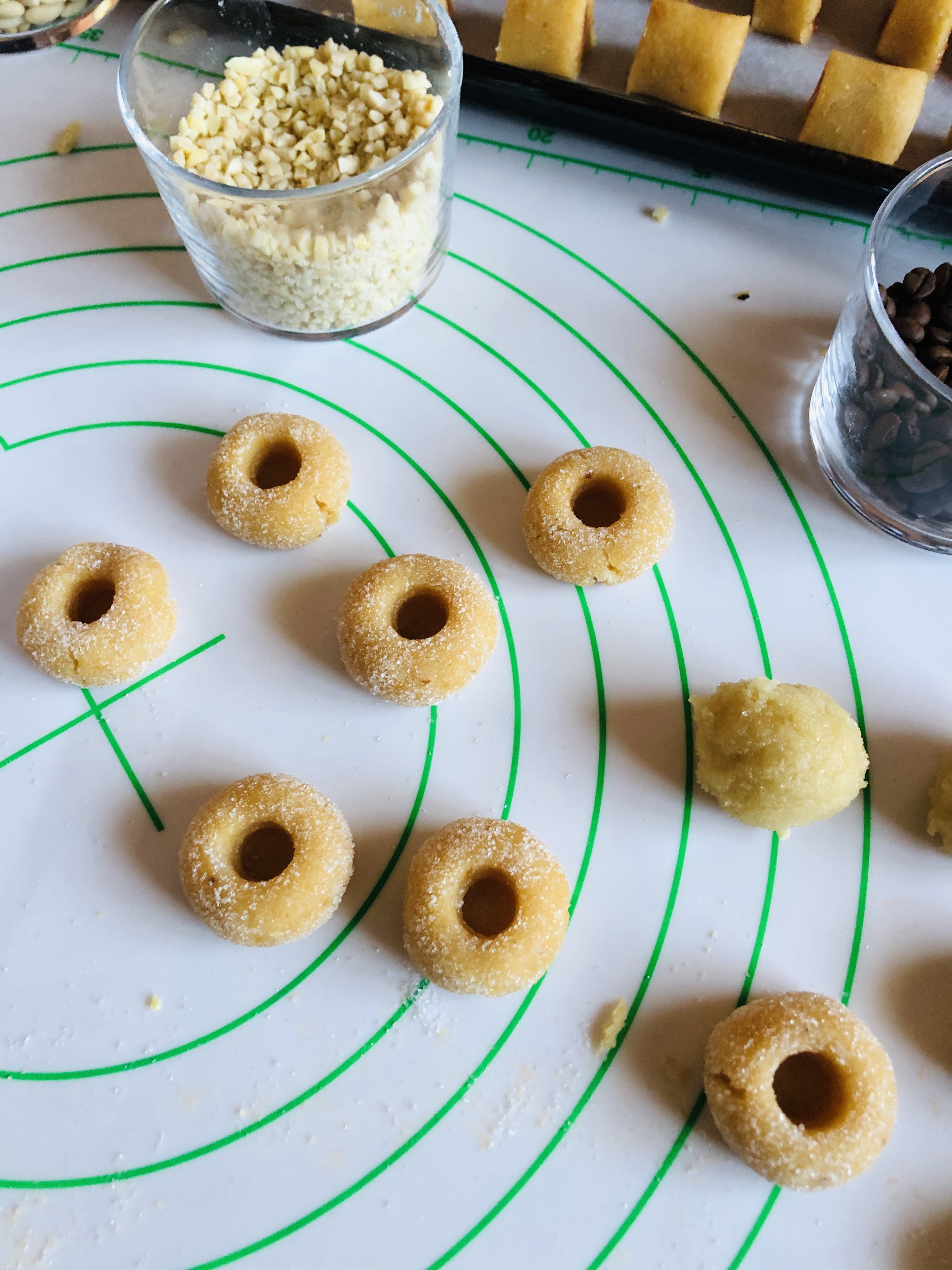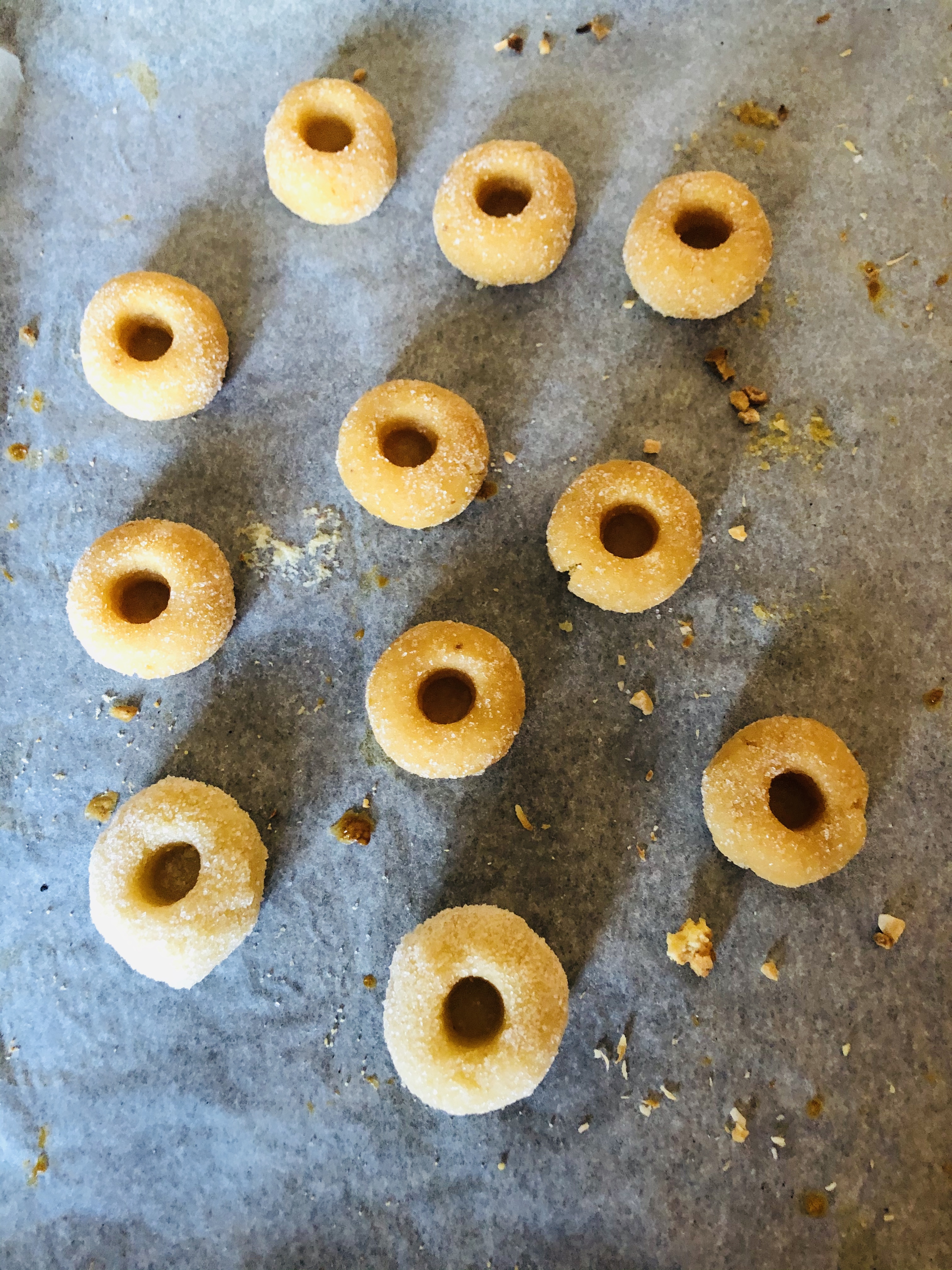2- Formar bolas del tamaño de una nuez aprox. Rebócelas con azúcar y cm la ayuda de un cilindro de un cm más o menos, haga un ajujero en medio sin llegar al fondo. Hornear durante 6 minutos arriba y abajo. Tienen que quedar dorados, sesgún vuestro horno modificar-los el tiempo. Una vez horneados los pneis en una rejilla para que se enfrien.