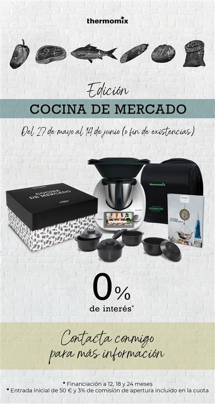 A partir de hoy al comprar tu Nueva Thermomix puedes adquirir esta nueva Edición “COCINA DE MERCADO” un fantástico libro de cocina temático de nuestra gastronomía. Disfruta de tu nueva THERMOMIX cocinando productos de temporada que nos aportan todo el sabor y nutrientes para sacar el mayor beneficio nutricional.