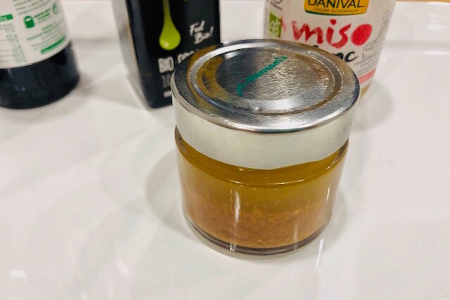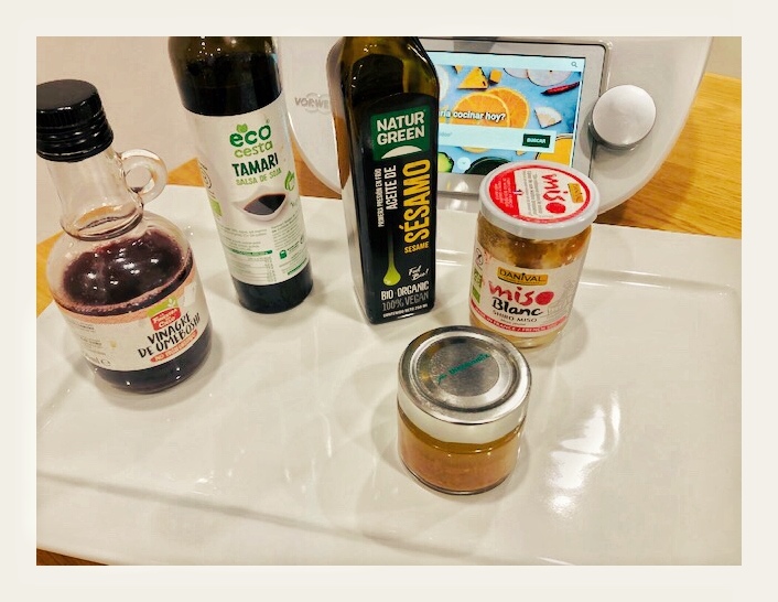 En esta receta voy a utilizar miso blanco o shiro miso, sabor suave. También voy a poner vinagre de Umeboshi, son una clase de ciruelas fermentadas. Este vinagre es el menos ácido. Dos ingredientes fermentados.