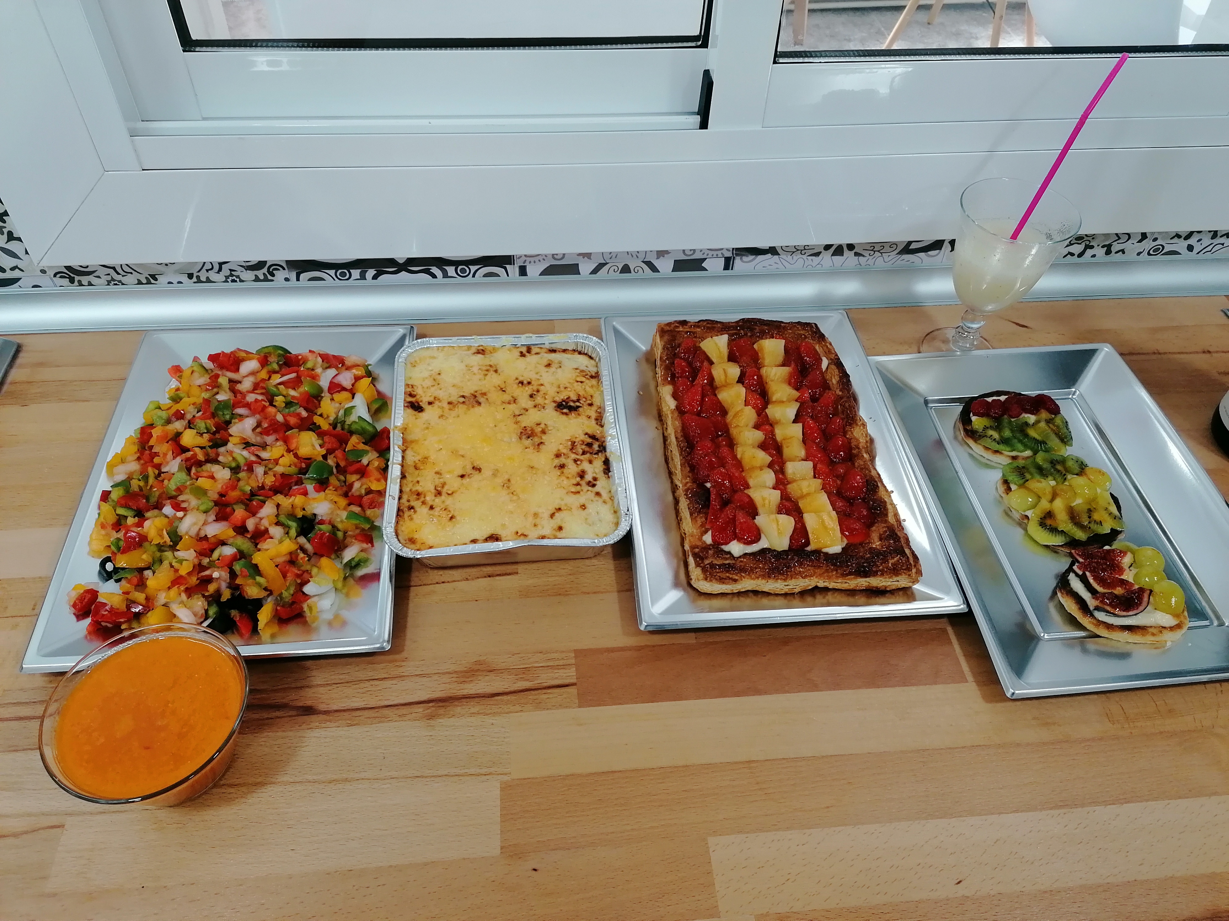 El resultat ha sigut aquest menú tan variat, pels que volgueu prendre nota hem cuinat esqueixada de bacallà amb vinagreta, moussaka grega, tarta de full amb crema i fruita i sorbet de llimona al cava. Tot en una horeta i mitja emplatat i sincronitzat amb tots vosaltres.