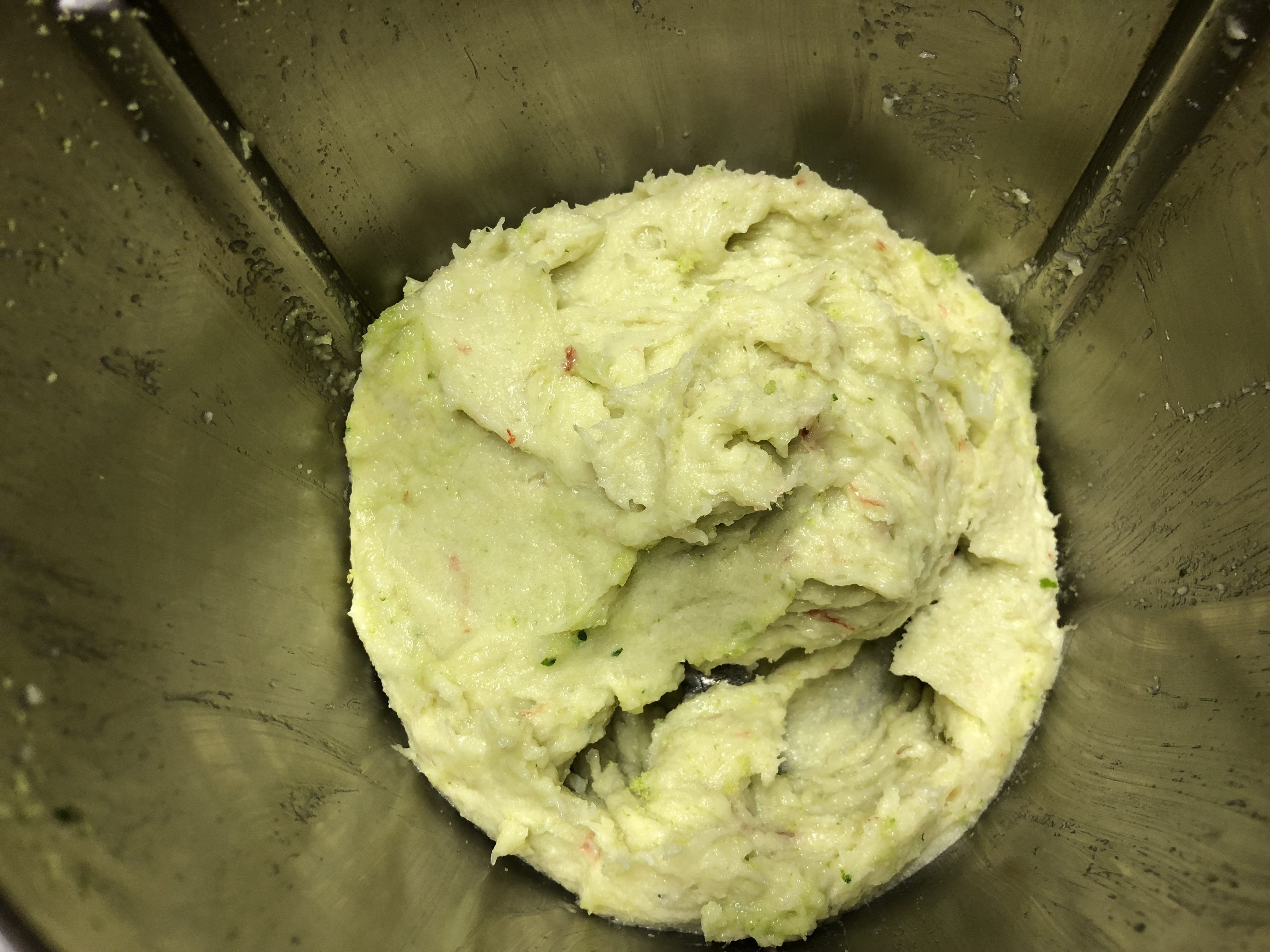 3º. Añada los gambones, el bacalao, el huevo, la leche y 1 pellizco de sal. Trocee 15 seg/ vel 5. Retire y reserve.