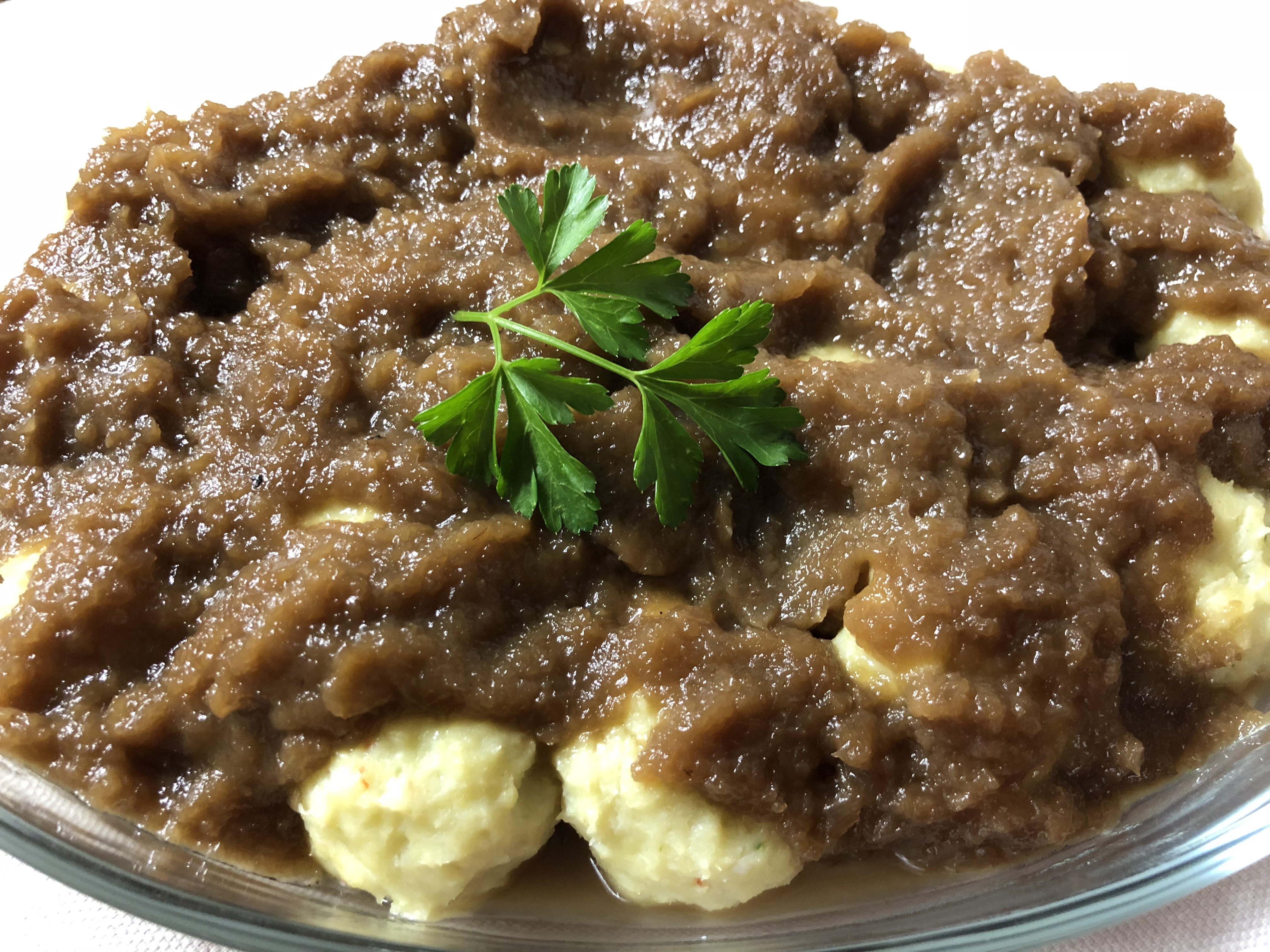 8º. Sitúe el varoma en su posición y programe 15 min/Varoma/velocidad 1. Retire el varoma. Ponga las albóndigas en una fuente honda y vierta encima la salsa del vaso. Sirva con guarnición de arroz blanco, patatas fritas, cuscús, etc.