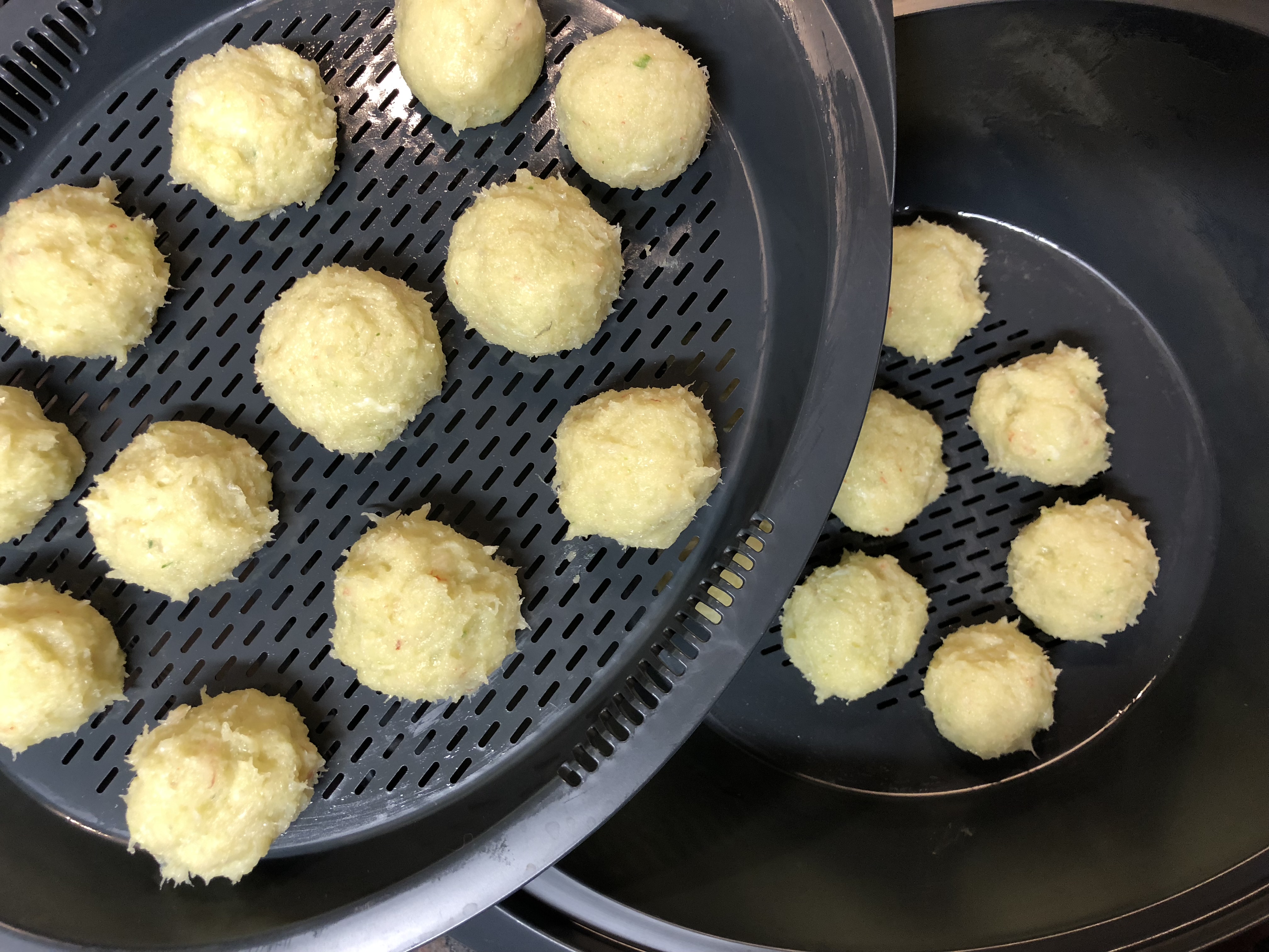 7º. Ahora con las manos untadas en aceite, forme las albóndigas y colóquelas en el recipiente y la bandeja varoma. Tape el varoma i reserve.