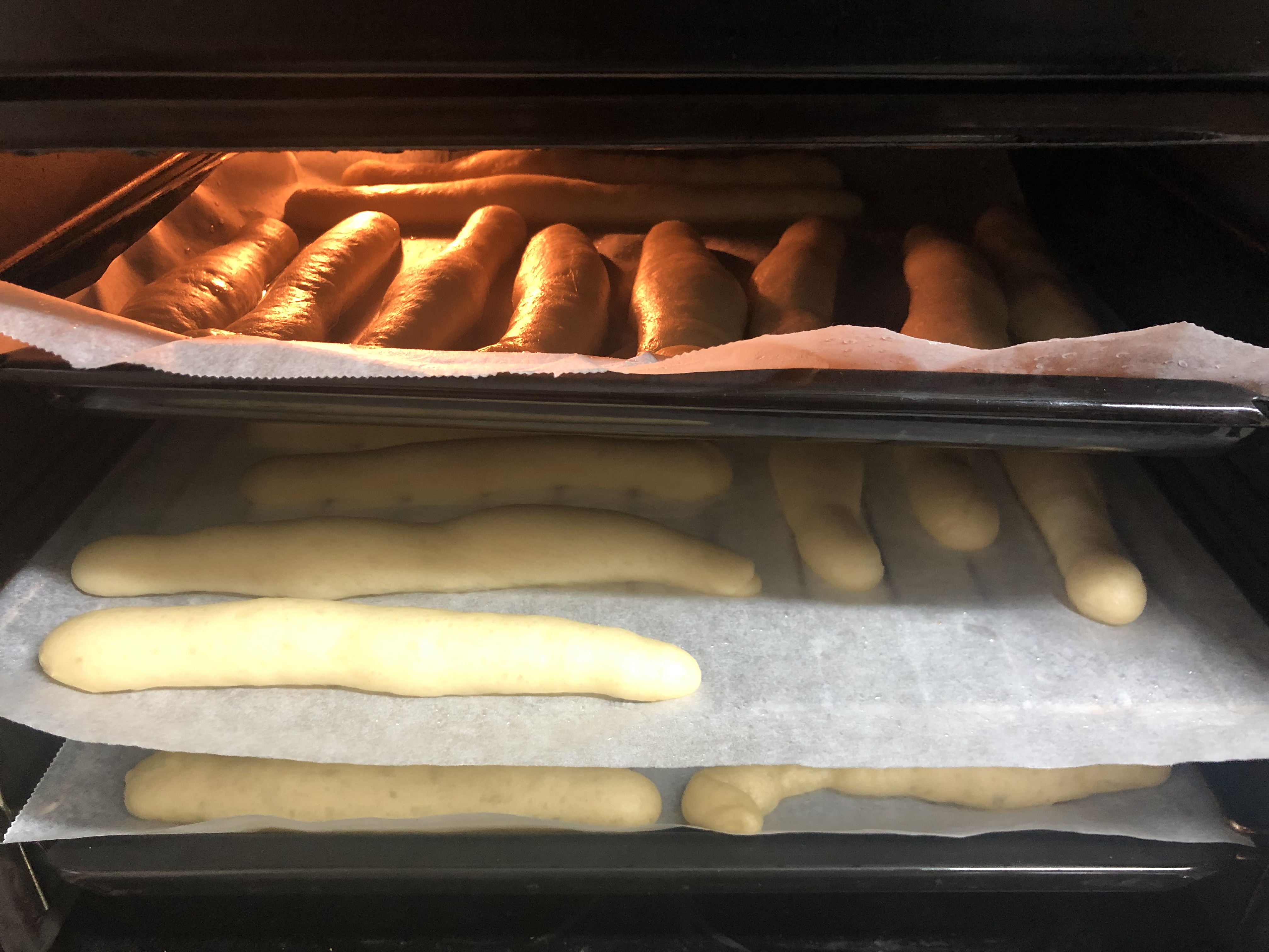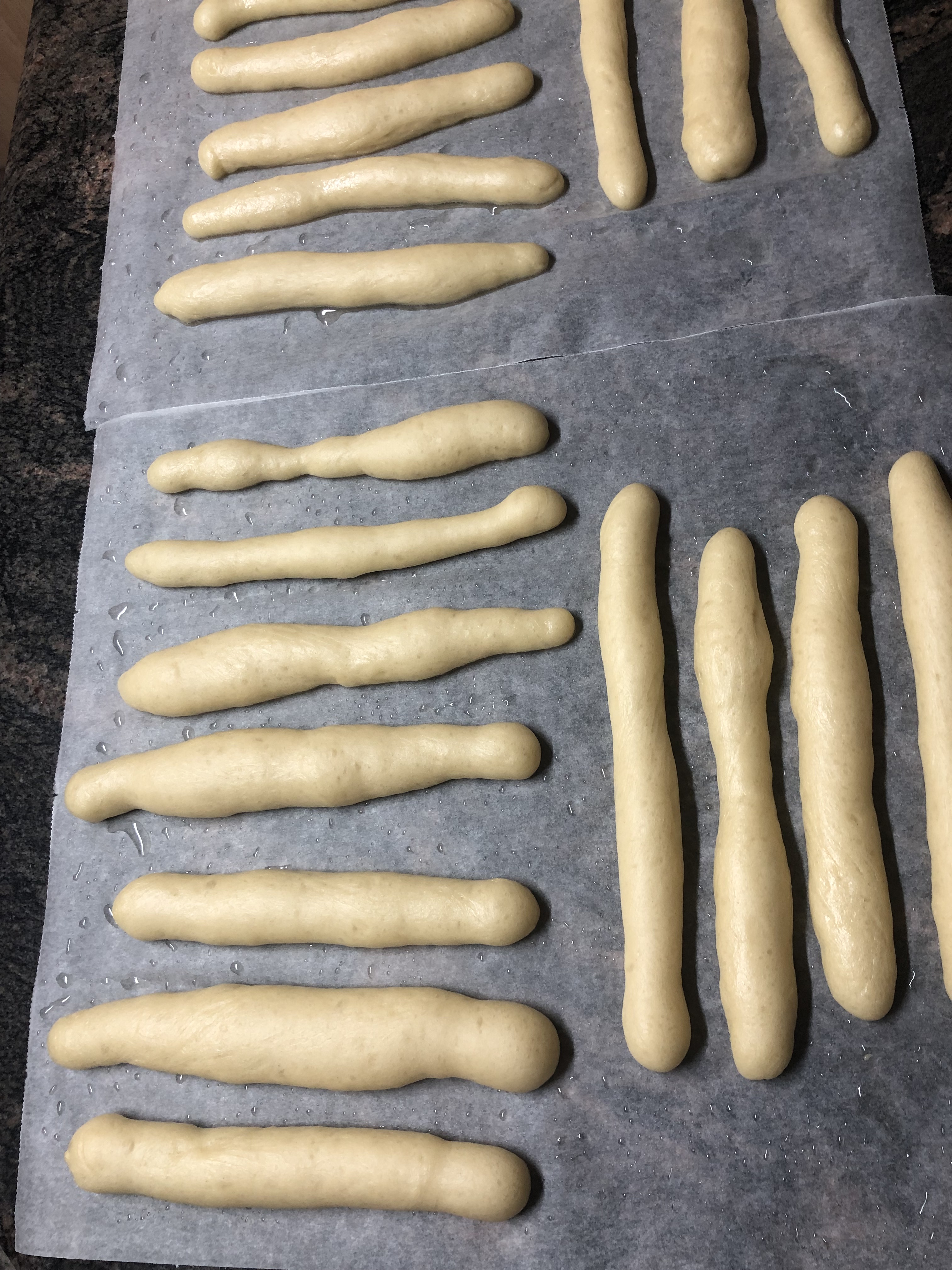 3. Con las manos untadas en aceite forme bolas de 25 g aproximadamente y estírelas para formar cilindros de unos 20 cm de largo, haciendo rodar la masa sobre la encimera con las palmas de las manos. Colóquelos en una bandeja forrada con papel de hornear con suficiente espacio entre ellos. Deje reposar durante 2 h