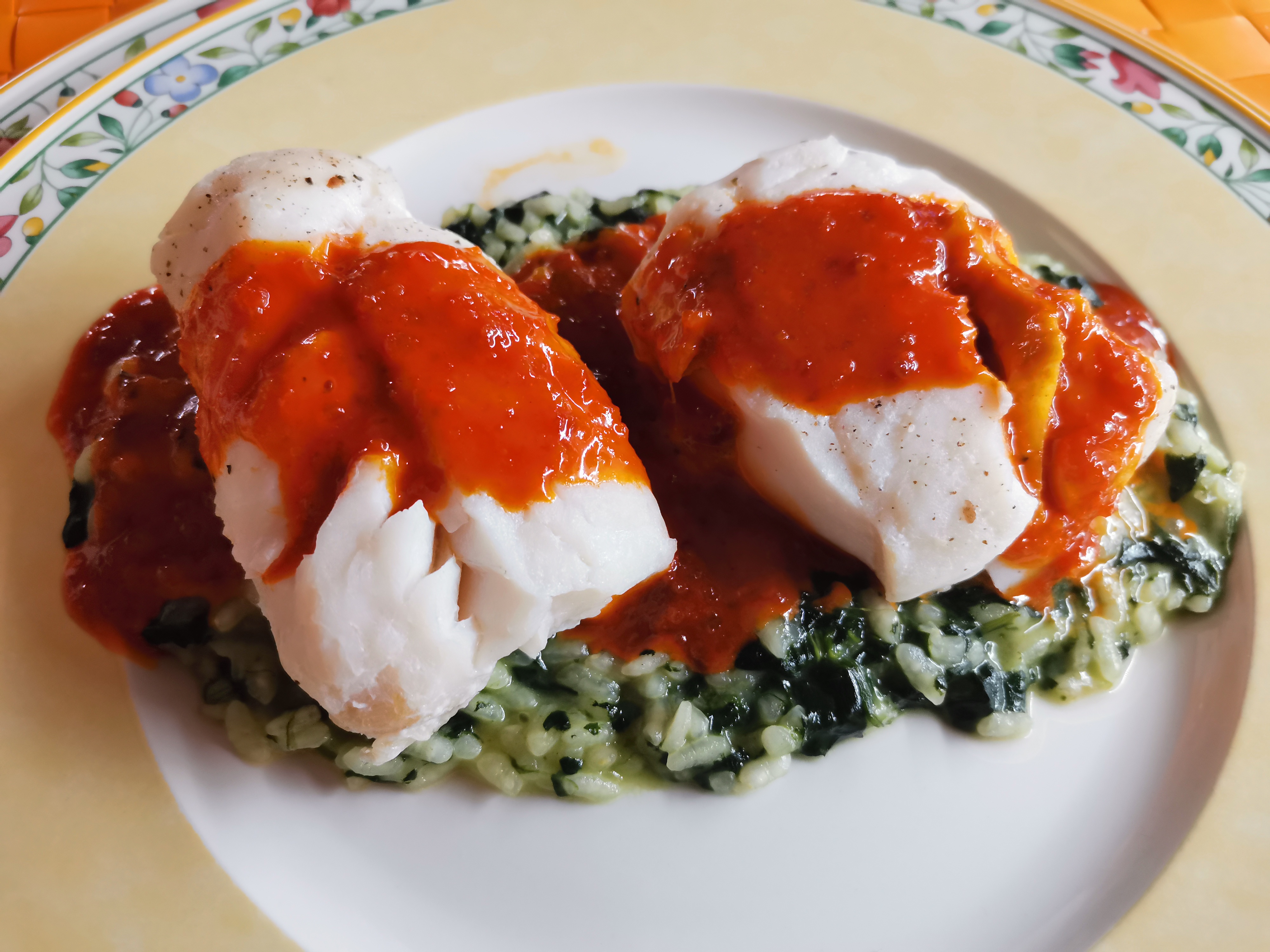 RISSOTO VERDE CON BACALAO Y SOBRASADA A LA MIEL