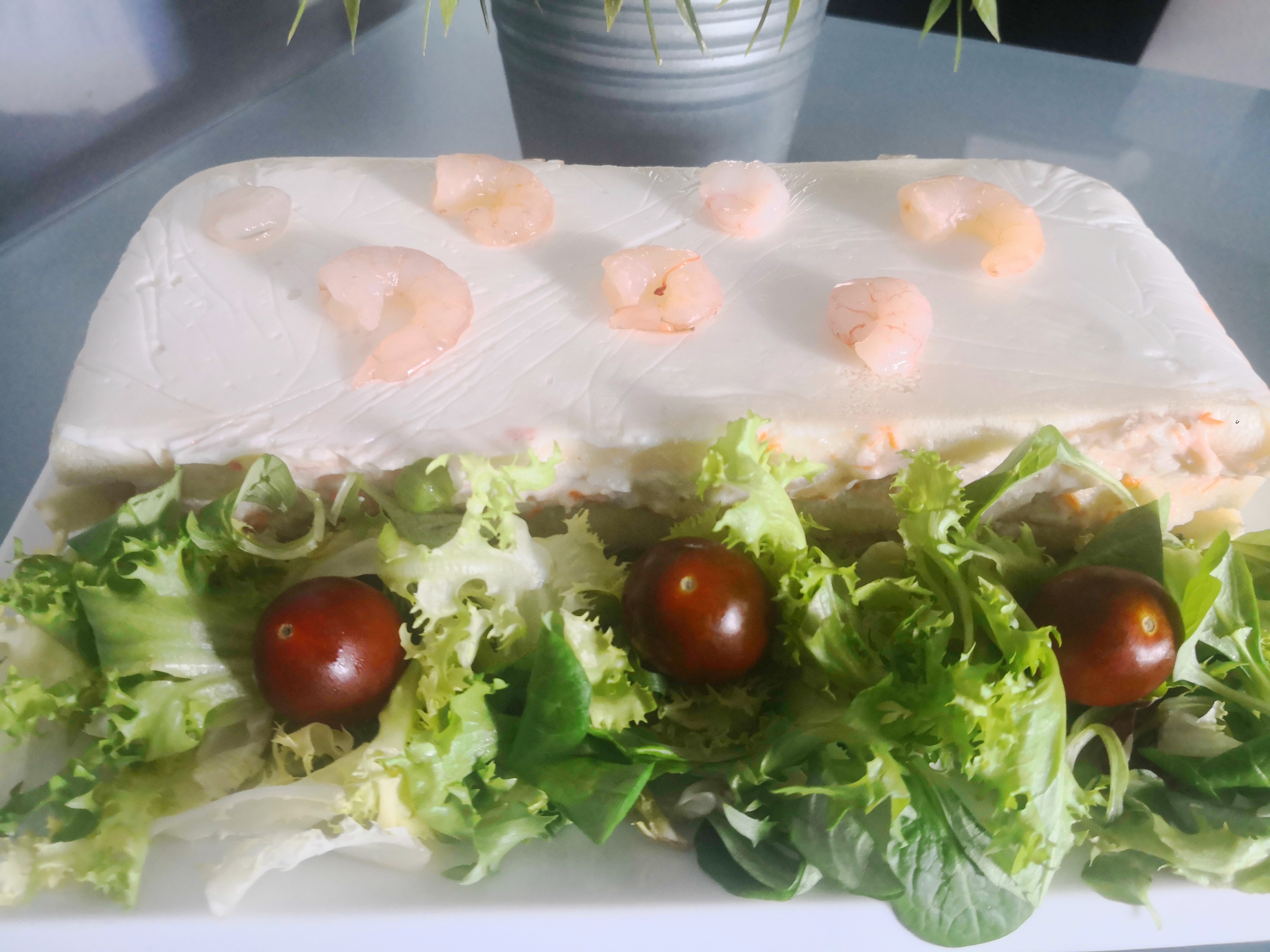 5. Treure del motllo el pastis i emplatar amb una safata i decorar amb gambetes, enciam, cogombrets, cherrys, etc.