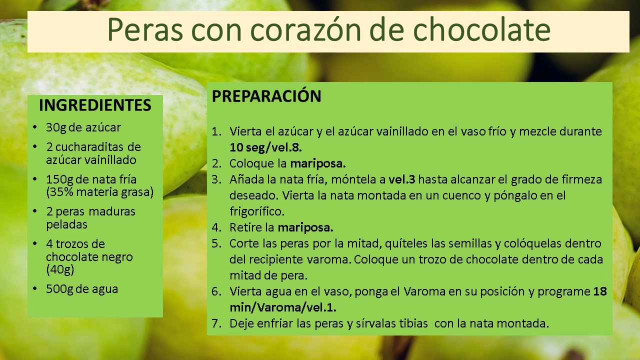 En otoño o invierno nos apetecen más las comidas calientes, pues esta es otra manera de comer fruta. Éstas peras estan hechas con un trozo de chocolate y se acompañan con nata montada.