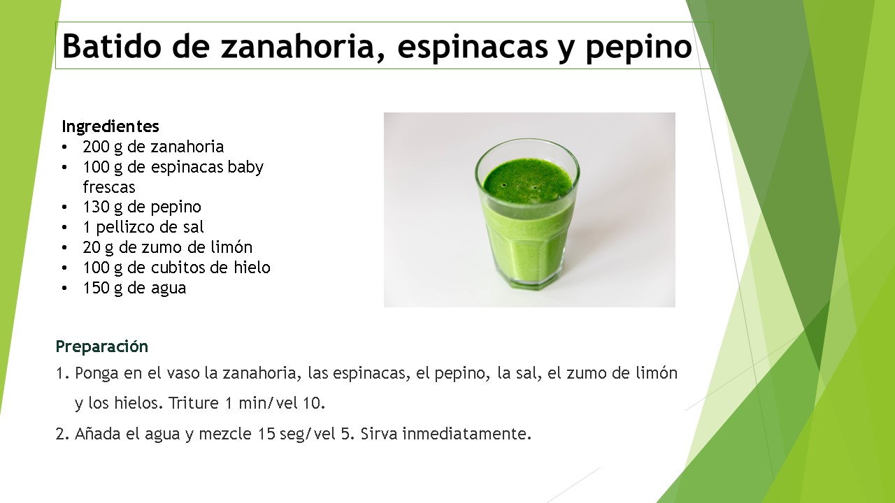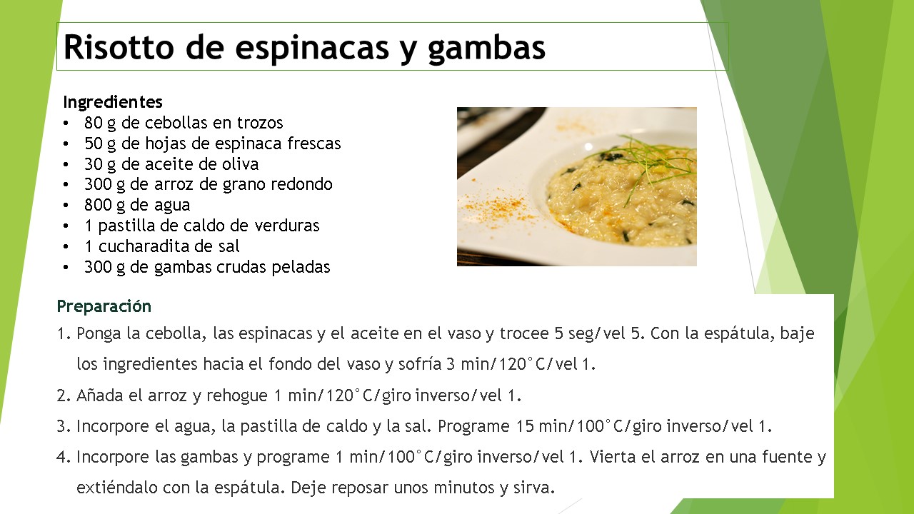 Hemos preparado un batido verde, sano y muy refrescante, con zanahorias, espinacas y pepino. También hemos cocinado un risotto de espinacas y gambas delicioso. Luego hemos preparado un pollo a la mostaza realmente fácil de hacer y muy sabroso.