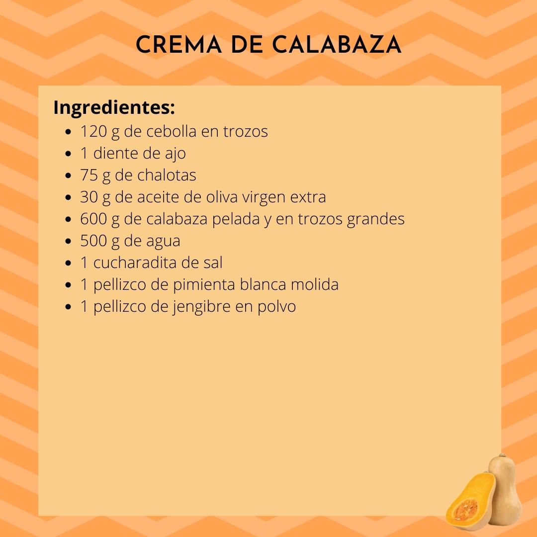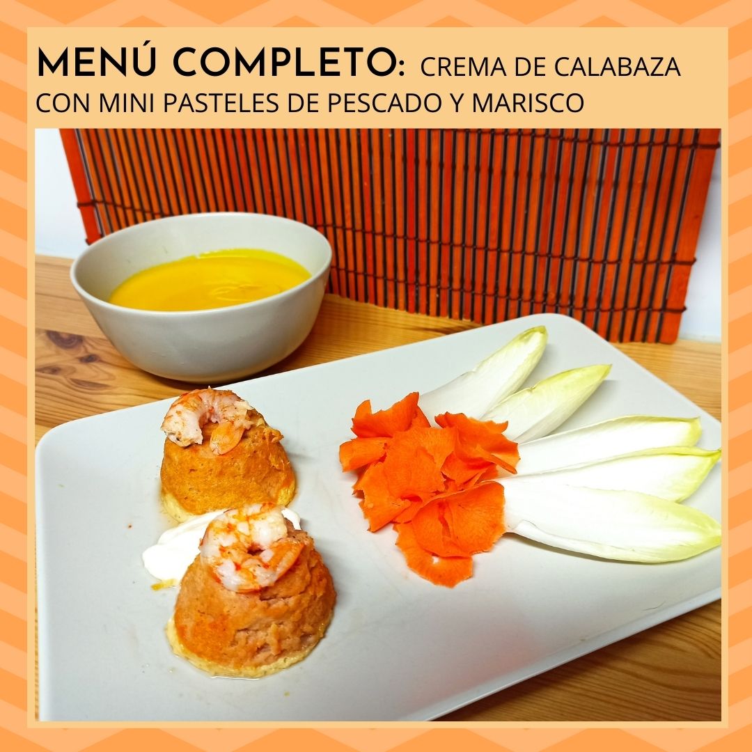 Menú completo: crema de calabaza con mini pasteles de pescado y marisco