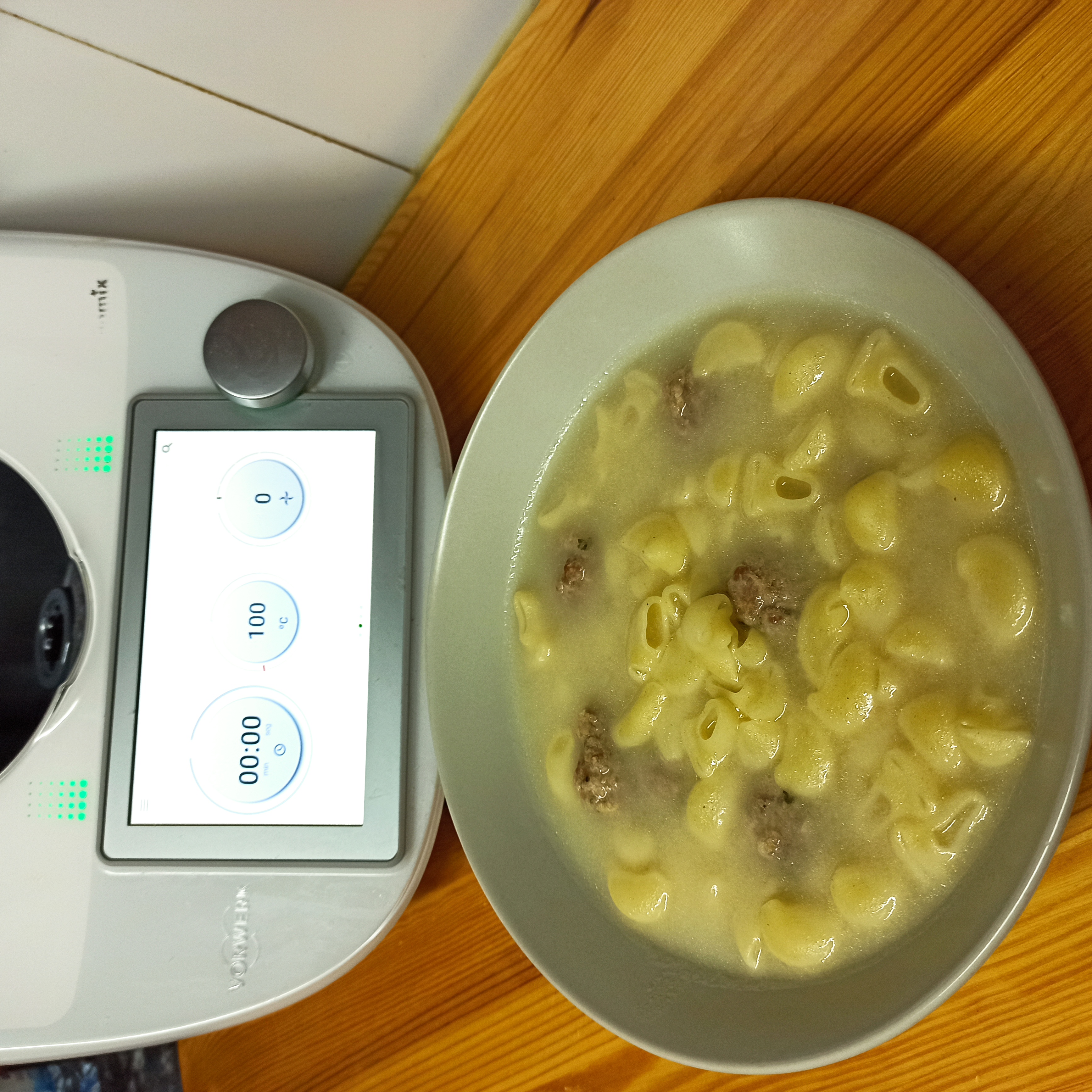 5. Després d'aquests 60 minuts, barrejarem els dos caldos i reservarem el pollastre. Posarem 1.5 l de caldo al got amb la pasta que volguem i les mandonguilles i programarem temps de cocció de la pasta / 100°/ gir invers / vel cullera.