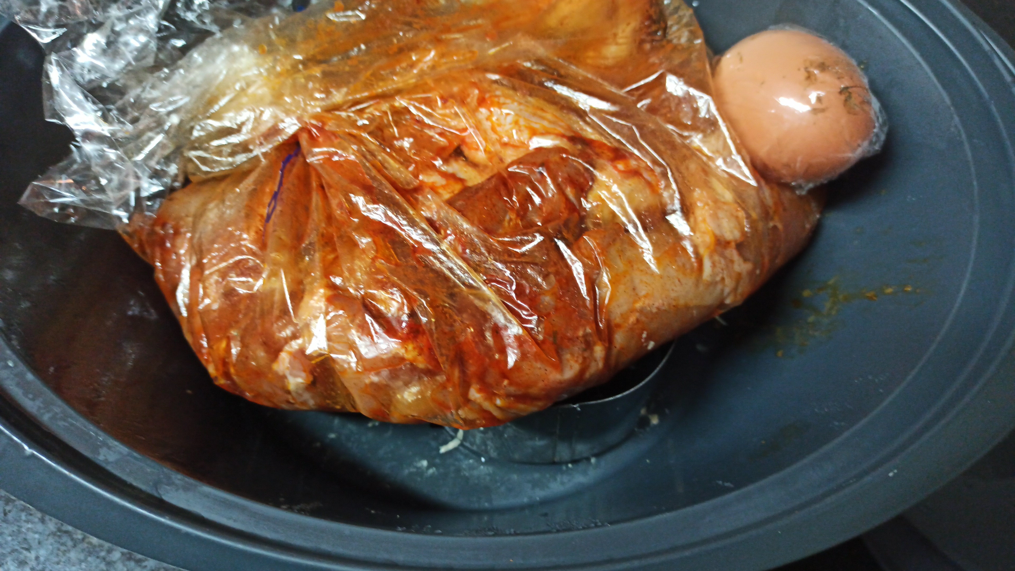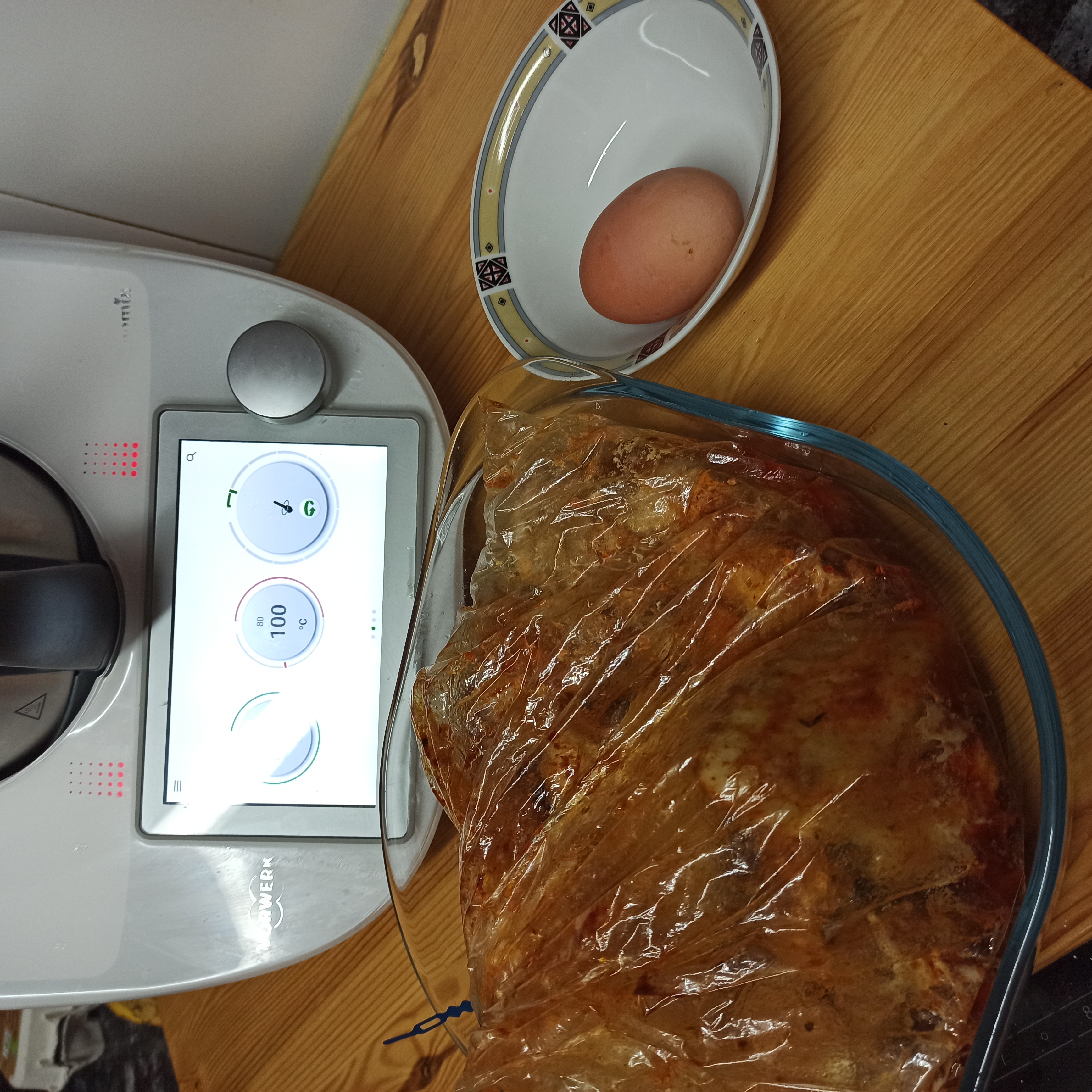 4. Un cop passats els 60 minuts, tregui les mandonguilles del recipient i l'ensaladilla de la safata. Aboqui el caldo a un recipient i torni a posar el cistellet al got, una culleradeta de sal i aigua fins arribar a dos dits de dalt de tot. Programi 60 Min / varoma / vel 1. Aquesta vegada al Varoma hi posarem la bossa amb el pollastre vigilant de no tapar tots els forats del recipient Varoma i dos O tres ous embolicats amb film transparent. Per evitar tapar els forats pot posar un cercle d'emplatar sota la bossa, tal i com veieu a baix.
