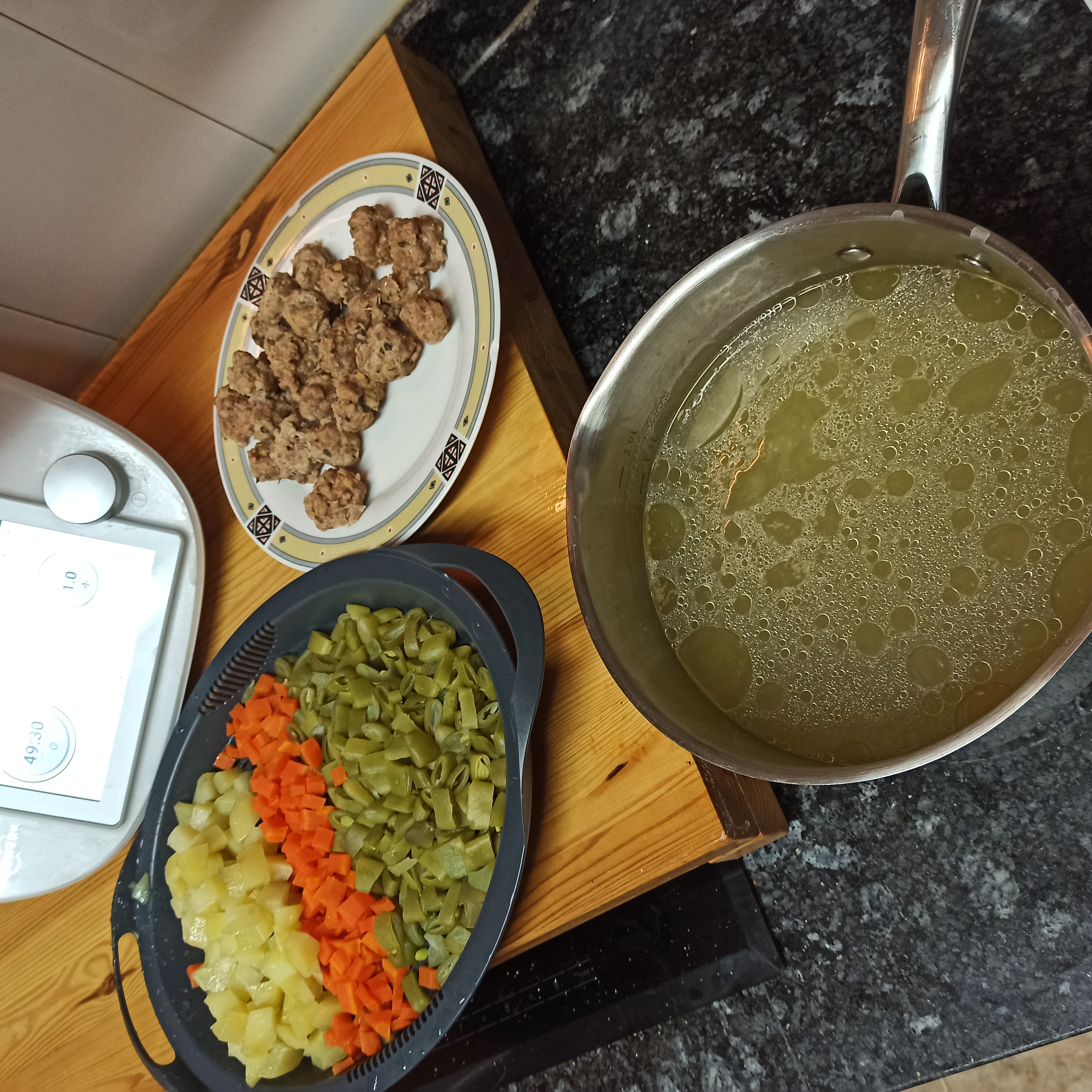 Caldo amb mandonguilles, ensaladilla i pollastre (batch cooking)