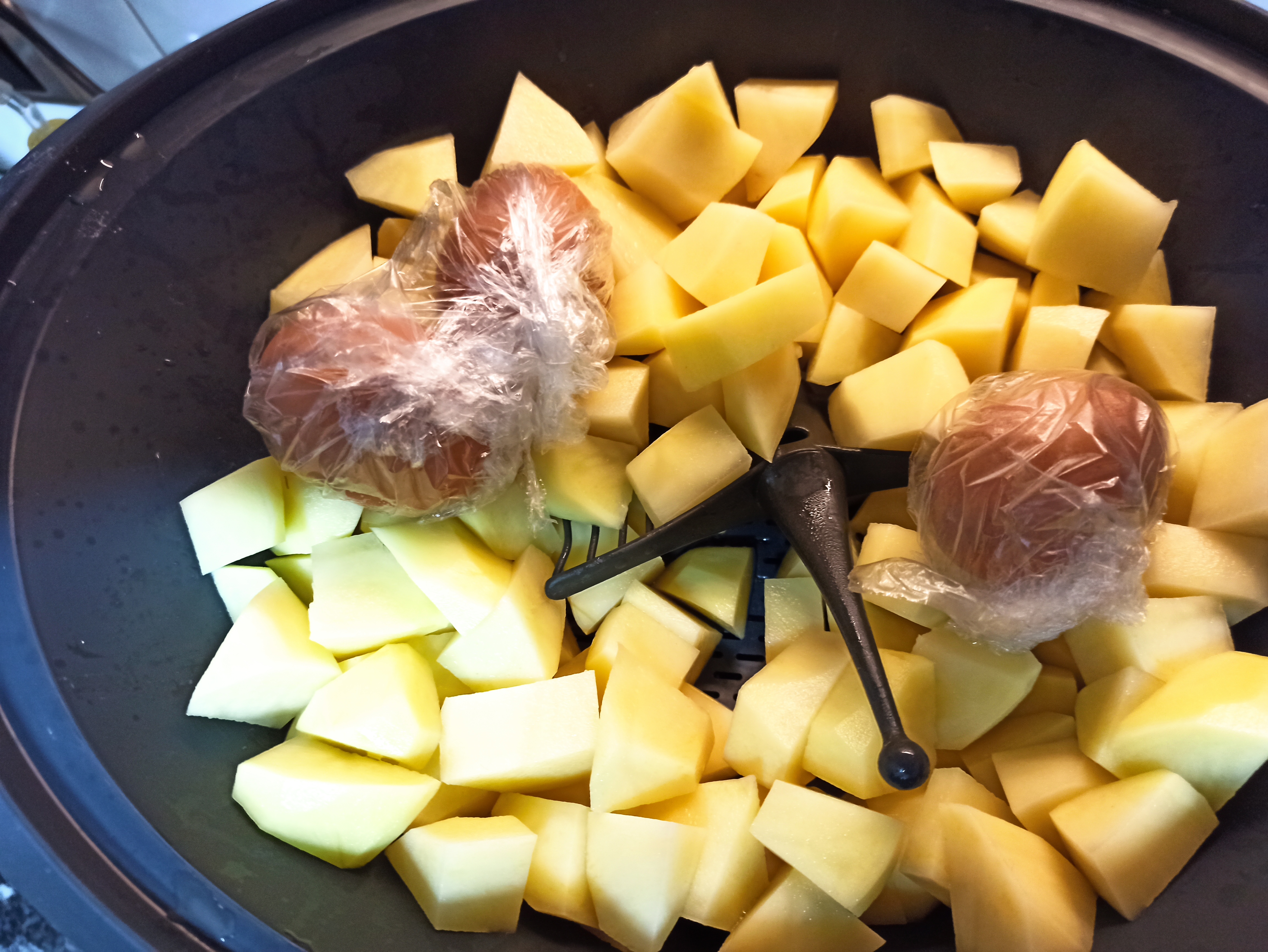 - Envolvemos los huevos en film transparente y los ponemos encima de las patatas. Tenemos que dejar agujeros del varoma libres para que pase el vapor.
