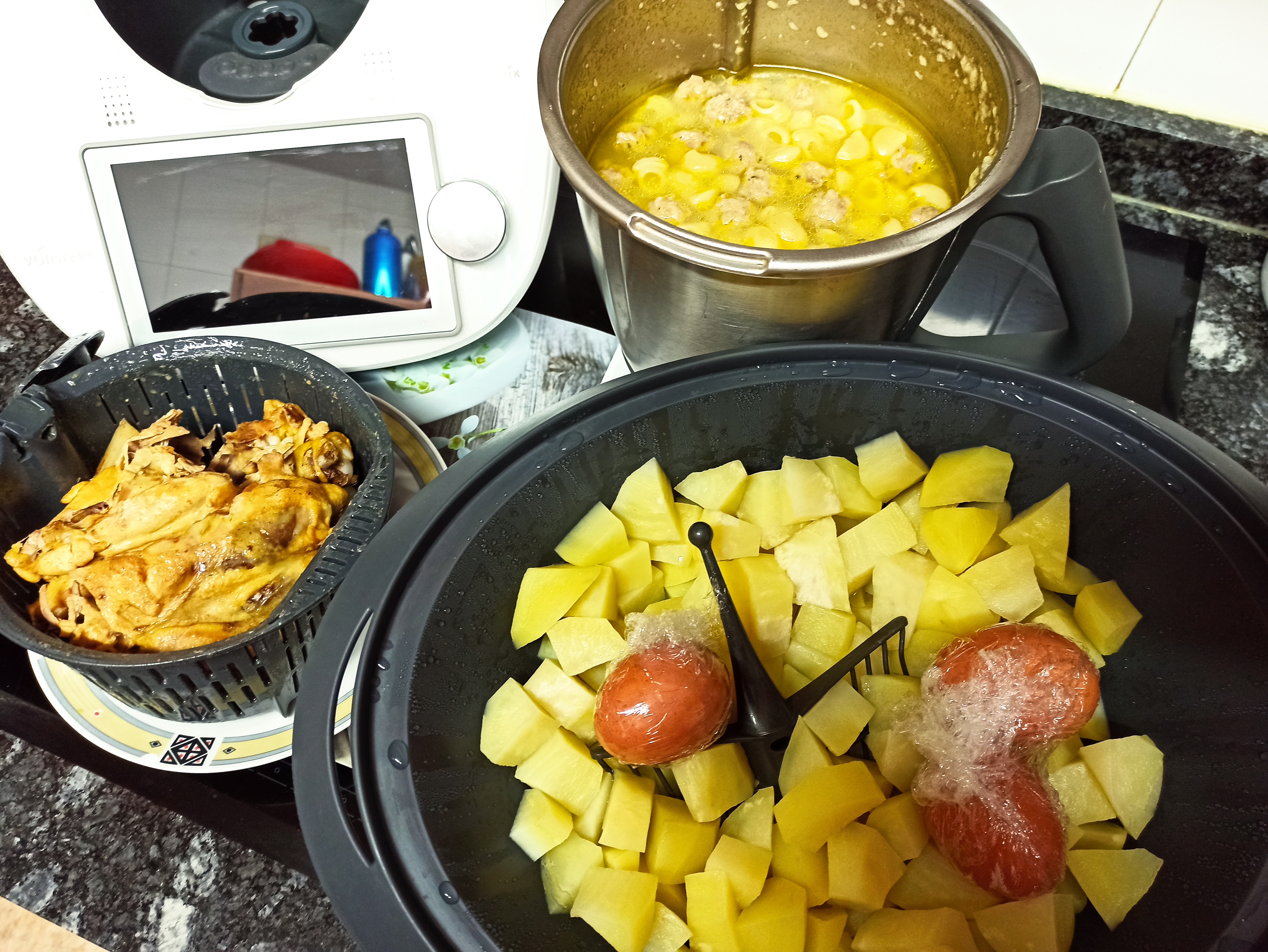 - Mientras ponemos la carcasa de pollo, la patata, la zanahoria y el nabo en el cestillo.